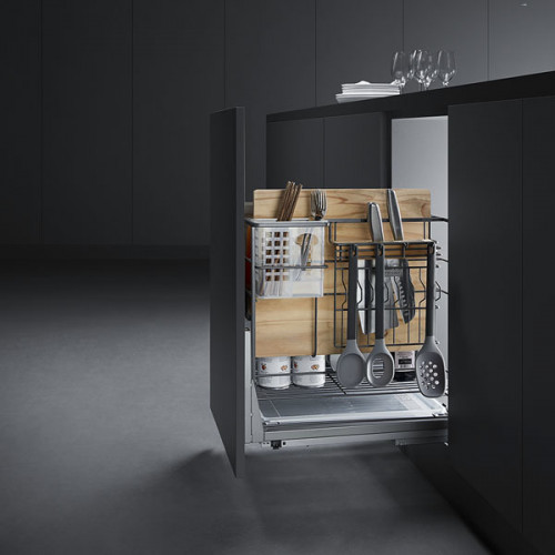 Выдвижная трехуровневая корзина Unihopper выполнена в благородном темно-сером цвете. Проволока из которой сделаны эти бутылочницы имеет плоское сечение, что полностью соответствует требованиям в современном дизайне кухонных аксессуаров класса премиум. Направляющие этой корзины имеют втроенный доводчик для плавного и абсолютно бесшумного закрывания.