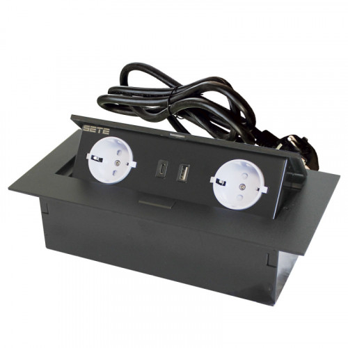 SETE Удлинитель SBT-R2UCT-20 встраив.,2 гнезда,1 USB, 1 type C, ЧЕРНЫЙ,с кабелем
