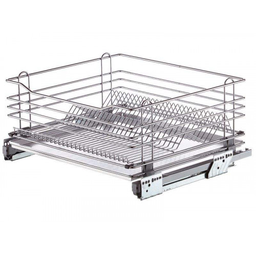 В комплекте сетчатая корзина, направляющие частичного выдвижения, поддон, крепление к фасаду (позволяет регулировать фасад по вертикали и горизонтали)